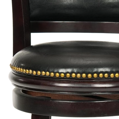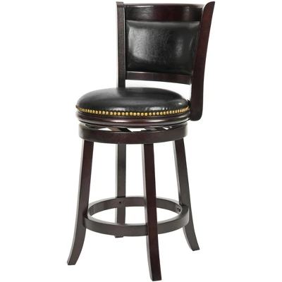 The Brockway Counter Stool is designed to give your home fashion and function with a frame crafted of Malaysian Oak with a cappuccino finish and a swivel seat covered in black bi cast leather. The seat back features an inset cushion, also covered in black leather, for comfortable sitting at counters and pub tables. The seat height is 24 inches. Assembly required. Care Instructions: To prevent overall soiling, frequent vacuuming or light brushing is recommended. Cushions and pillows should be turned on a weekly basis. Down filled cushions should be brushed rather than vacuumed. Spot clean, using a mild water free solvent or dry cleaning product. Only a professional cleaner should undertake a complete overall cleaning. The use of steam or water based cleaners may cause excessive shrinking or staining.