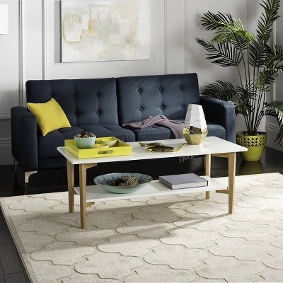 Inspired by the iconic interiors of a top Parisian art collector, this contemporary coffee table is a modern classic. Its smooth white surface and natural finish highlight its clean, geometric style, and two tiers of storage make it a designer favorite. Care Instructions: Dust regularly with a soft, dry cloth. Never use oiled or treated cloths on lacquered finishes. Some finishes can be wiped with a damp (not wet) cloth, followed at once by rubbing with a dry cloth to remove fingerprints and smudges. For persistent spots, gently clean with a soft cloth and a solution of water and mild soap, make sure to wipe dry. Use adhesive felt pads, coasters and placemats to protect your furniture.