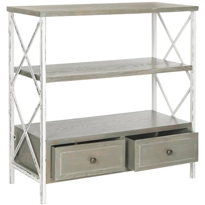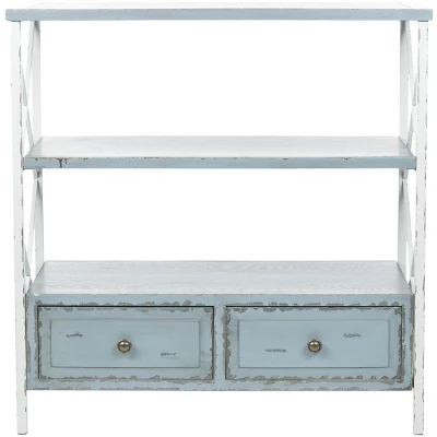 Romantics will fall for the graceful charm of this shabby chic Chandra Console. Brimming with vintage ambiance, Chandra is crafted with distressed finishes on its smokey X frame and contrasting pale blue shelves and drawers, making it perfect for rustic country interiors.