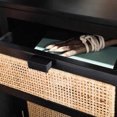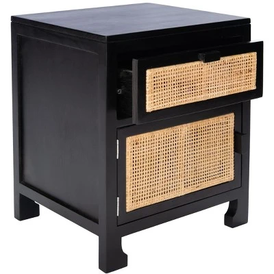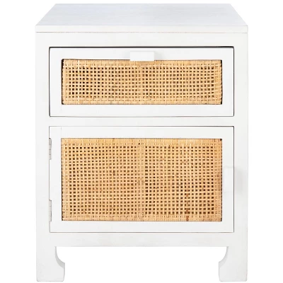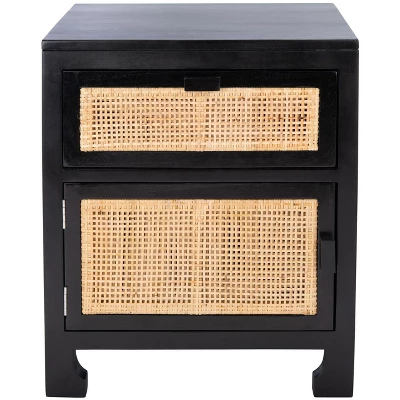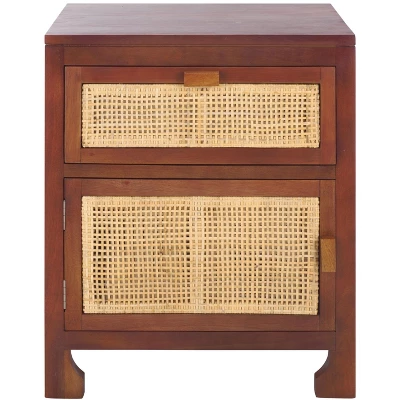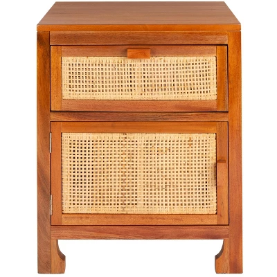 This Dave Nightstand enriches your bedrooms aesthetic with relaxed coastal ambiance. Daves door and drawer are given soothing tropical with natural rattan, pairing beautifully with its matching natural finished mindi wood frame. Subtle metal pulls elevate the look, making it perfect for any decor.