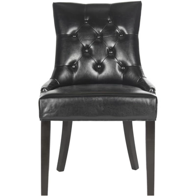 The stylish Harlow ring chair by Safavieh transforms any dining room with instant glamour. Dressed up with silver nail heads and a clever metal ring on its back, Harlow is shown with birch legs in espresso. Button tufts on the front of the tapered backrest add to the allure of this set of two chairs. Care Instructions: Although leather is one of the most durable upholstery materials, proper care is vital to maintain its appearance and performance. Dust weekly using a soft, clean cloth slightly dampened with distilled water. Blot spills immediately with a soft, clean absorbent dry cloth.