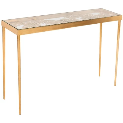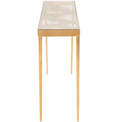 Redefine the living room with this Leilani Console. An ethereal glass design highlights its delicate palm leaf artistry, while its rich gold leaf finish adds a luxurious touch. A contemporary collectors item, its a hallmark of gracious living.
