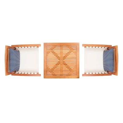 The hottest rooftop bars in Palm Springs inspired this 3 piece bistro set. Crafted in a warm natural finish, its contemporary bar height table and sleek matching chairs with beige upholstery and navy striped pillows lend instant style to any outdoor terrace or entertaining area. This bistro set adds a fresh look to any outdoor space.