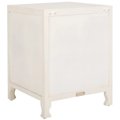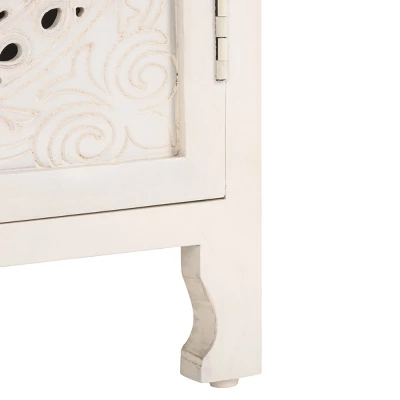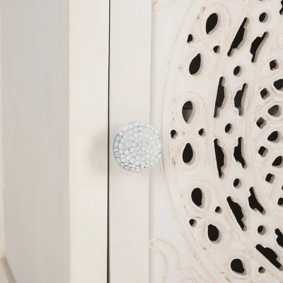 Make a bold and eclectic statement with the Regius nightstand. Mango wood is beautifully cut out to deliver an artistic and eye-catching pattern. Our eclectic side table features a Mandela design to serve as an optical delight for your bedroom. It is completed with subtly curved legs and round handles to add a touch of grace and elegance. With a classy white wash finish, our artistic facade opens to reveal two roomy shelves, perfect for storing and organizing all your nighttime essentials.