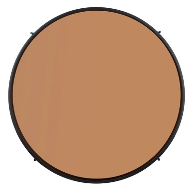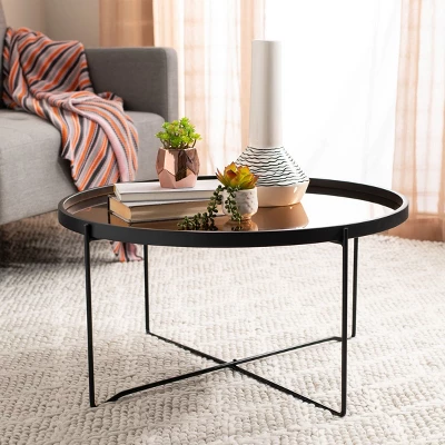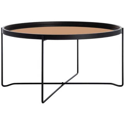 Brilliant color, rich materials and bold form define this contemporary round tray top coffee table. Ideal for any living room, slender black legs elevate the minimalist black wood frame surrounding its versatile rose gold glass tray top. Care Instructions: Dust regularly with a soft, dry cloth. Never use oiled or treated cloths on lacquered finishes. Some finishes can be wiped with a damp (not wet) cloth, followed at once by rubbing with a dry cloth to remove fingerprints and smudges. For persistent spots, gently clean with a soft cloth and a solution of water and mild soap, make sure to wipe dry. Use adhesive felt pads, coasters and placemats to protect your furniture.