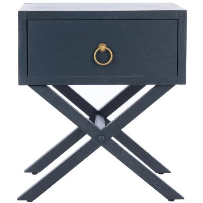 Discover the perfect fusion of timeless elegance and contemporary flair with the Odilia Nightstand. This piece masterfully elevates classic campaign style, presenting an object of endless appeal for today’s decor-smart bedrooms. Crafted with a durable acacia wood frame, its airy cross base imparts a feeling of open spaciousness. The sophisticated, smooth navy finish provides a bold, modern statement, beautifully accented by a single, shimmering gold drawer pull. The Odilia isn’t just a nightstand; it’s a chic, functional accent that promises to redefine and organize your personal sanctuary.