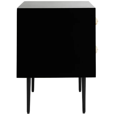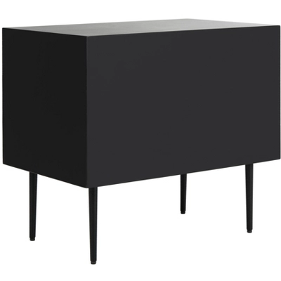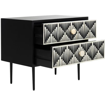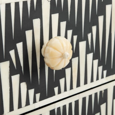 Crafted to be a statement piece, this dramatic contemporary nightstand elevates any bedroom. It stands gracefully on sleek, refined legs that give it a sophisticated, elevated profile. The modern black frame provides a striking contrast to the intricate bone inlay, which features a bold design of vertical stripes. This exotic pattern, meticulously handcrafted by skilled artisans, showcases a global elegance that makes the piece the focal point of any room. More than just a functional nightstand, it’s a piece of art that brings a sense of worldly flair and refined drama to your space.