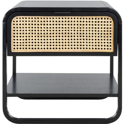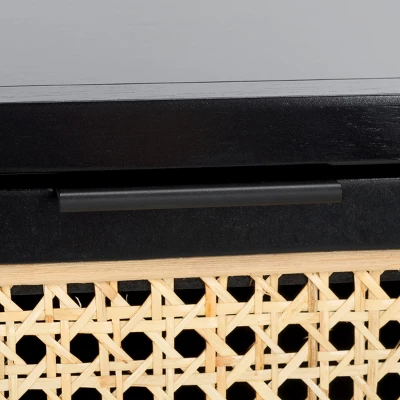 Give a chic and inviting update to your bedroom with our Yunis nightstand. The sleek and airy profile of the nightstand is accentuated with contrasting materials and textures. Woven rattan panels create a warm and breezy contrast with the sleek black finish. Finished off with inviting curves and a beautifully tailored pull, our nightstand attains a relaxed and refined presence. It is crafted in solid wood with one drawer and an open shelf to keep your essentials organized and within easy reach.